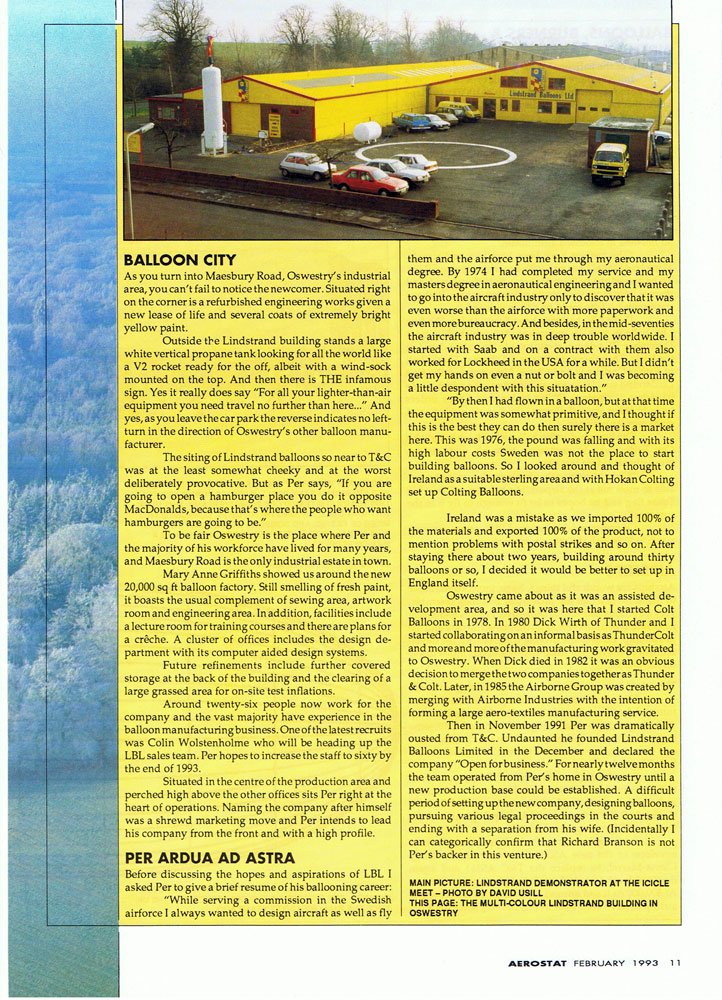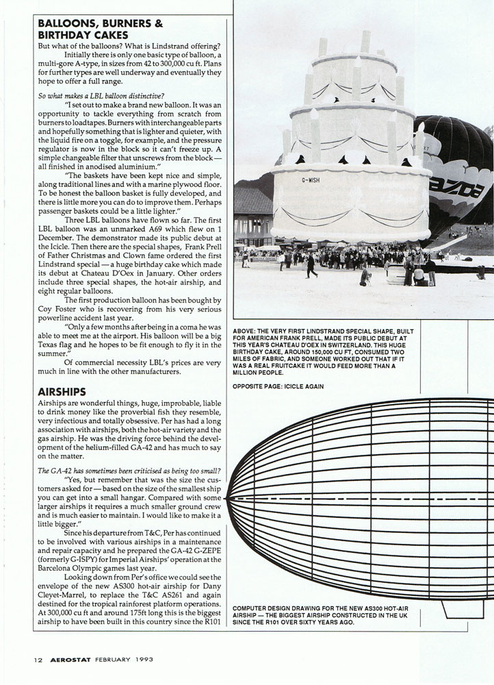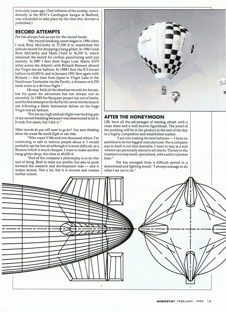 Lindstrand Balloons Limited (LBL) was founded in December 1991, after Per's abrupt departure from T&C when he was ousted from the board of directors. Interestingly, LBL took up shop in the very same Oswestry industrial park as T&C operated. In 1993 the first Lindstrand hot air airship was constructed, the immense AS300. At 300,000 cubic feet (8,500m3), it was, and still is, the world's largest hot air airship. It was designed and built as a replacement envelope for the T&C AS-261, and the AS300 continues in the same role to this day. In a continuation of Lindstrand's thermal airship developments, a scaled-down version of the AS300 was introduced in 1995. It was a two-man, 110,000 cubic foot (3,125m3) ship intended solely for aerial advertising and promotion. The HS110 was type certified in the UK, and to date around 8 specimen have been constructed. |